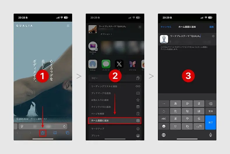 iOSでサイトをホーム画面に追加する方法 ブラウザのツールバーにある「共有アイコン」をタップ 展開されるメニューから「ホーム画面に追加」をタップ 名称を入力して、「完了」をタップ の3ステップでホーム画面に追加できます。